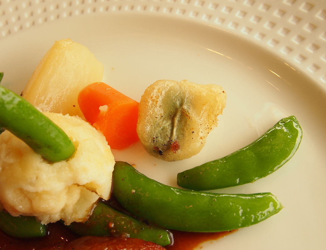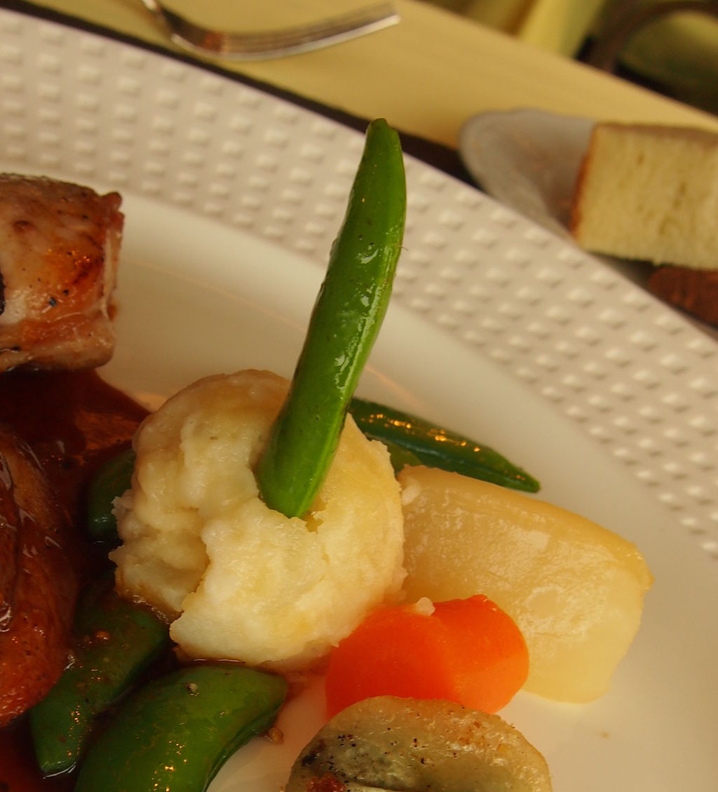 ↓ マッシュポテトにブッ刺したスナップいんげんは