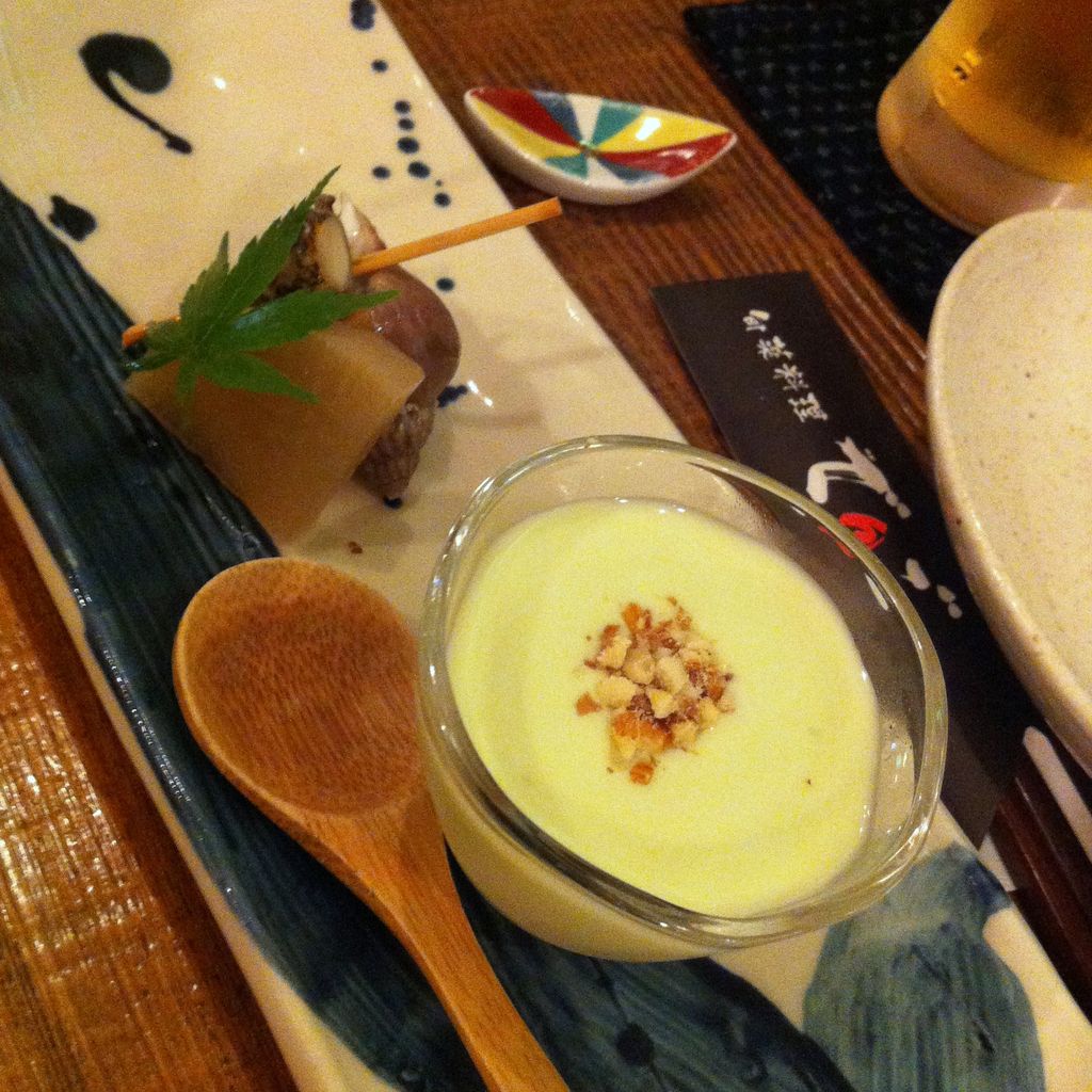 突出しは、グリーンピースのスープ、貝と大根の炊き合わせ
